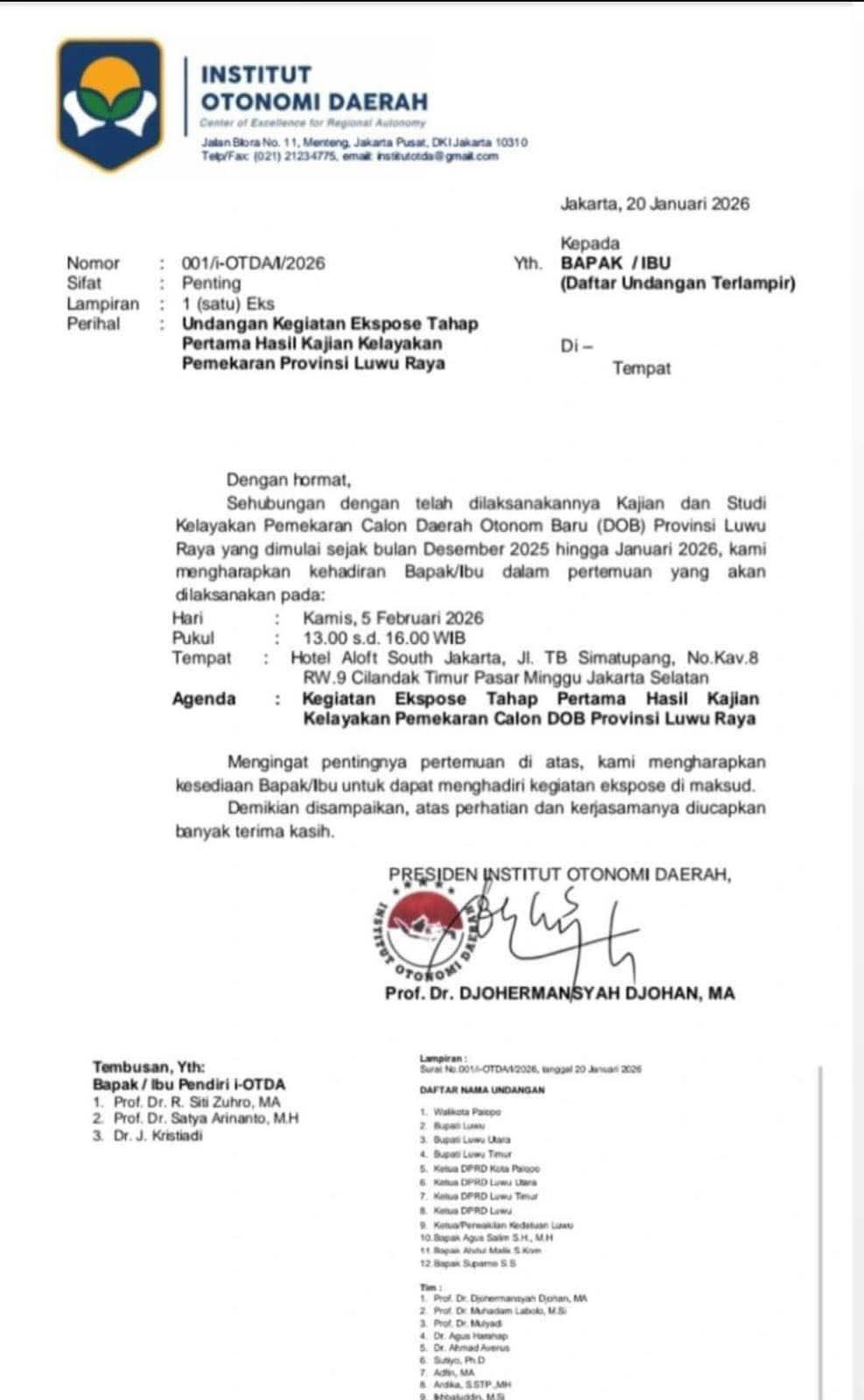 Dalam surat tersebut dijelaskan bahwa kajian dan studi kelayakan pemekaran Provinsi Luwu Raya telah dilaksanakan sejak Desember 2025 hingga Januari 2026. Ekspose tahap pertama ini akan memaparkan hasil kajian akademik dan teknokratis sebagai dasar kelayakan pembentukan Provinsi Luwu Raya.