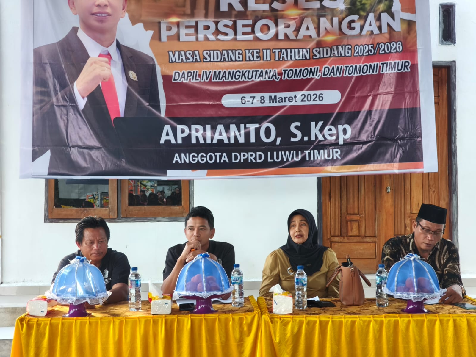 Luwu Timur, Luwurayapos.com – Anggota DPRD Kabupaten Luwu Timur, Aprianto, S.Kep, melaksanakan kegiatan Reses Perseorangan Masa Sidang II Tahun Sidang 2025–2026 di Daerah Pemilihan (Dapil) IV yang meliputi Kecamatan Mangkutana, Tomoni, dan Tomoni Timur.
