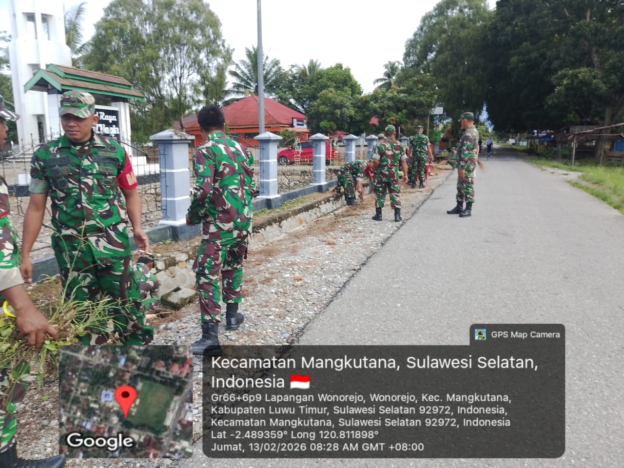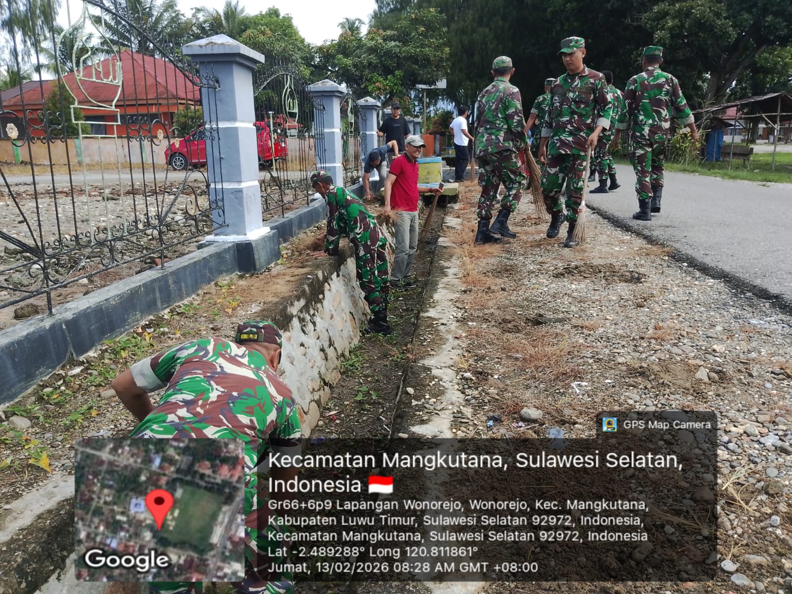 Luwu Timur, Luwurayapos.com – Personel Koramil 1403-14/Mangkutana melaksanakan kegiatan karya bakti (gotong royong) pembersihan saluran selokan di Masjid Nurul Yaqin, Desa Wonorejo, Kecamatan Mangkutana, Kabupaten Luwu Timur, Jumat (13/2/2026) pagi.