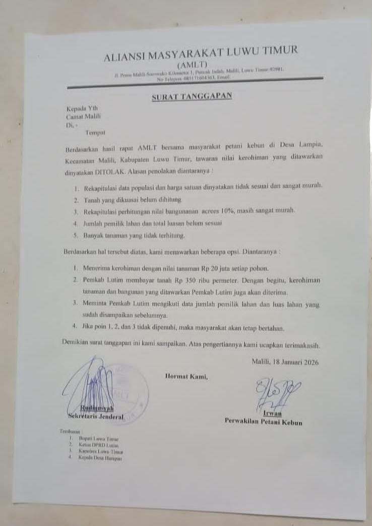 Permintaan tersebut tertuang dalam surat tanggapan yang disampaikan kepada Pemerintah Kecamatan Malili tertanggal 18 Januari 2026, yang ditandatangani atas nama Irwan sebagai perwakilan petani kebun dan Rudiansyah selaku sekretaris jenderal.