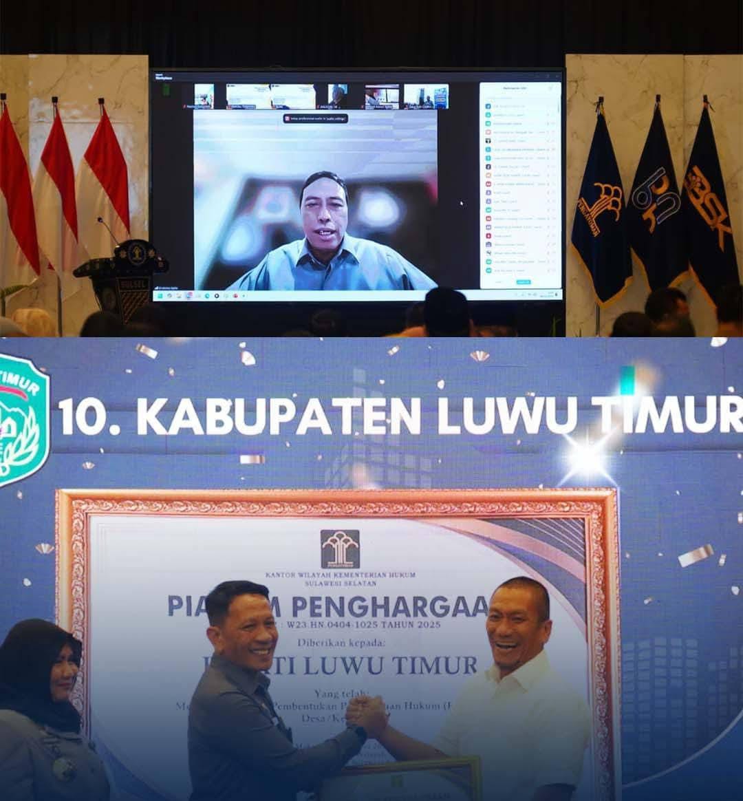 Luwu Timur, Luwurayapos.com – Bupati Luwu Timur, Irwan Bachri Syam, menerima penghargaan dari Kementerian Hukum (Kemenkum) Sulawesi Selatan yang telah mendukung dalam pembentukan Pos Bantuan Hukum (Posbankum) 100 persen di desa/kelurahan.