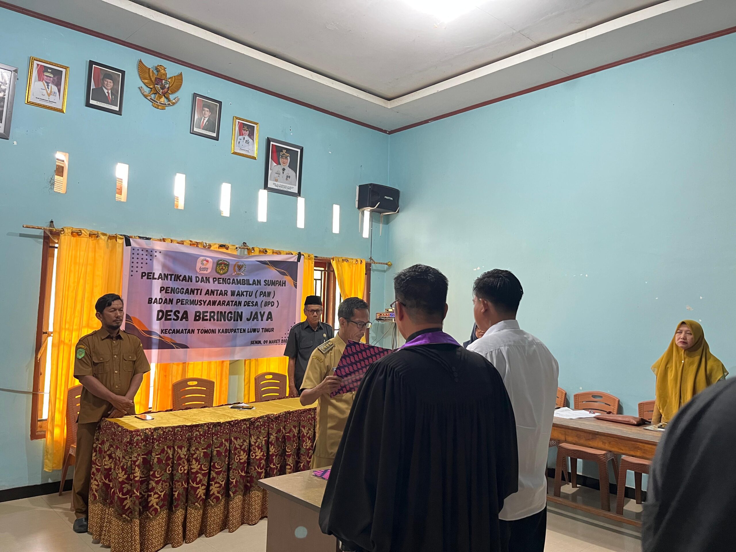 Luwu Timur, Luwurayapos.com – Camat Tomoni, Darwin melantik dan mengambil sumpah jabatan Pergantian Antar Waktu (PAW) BPD di Desa Beringin Jaya kecamatan Tomoni kabupaten Luwu Timur 9/3/2026