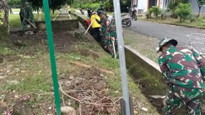 Luwurayapos.com-Luwu Timur, Personel Koramil 1403-14/Mangkutana Kodim 1403/Palopo bersama Aparat Desa Serta Mahasiswa KKN UNCP (Universitas Cokroaminoto Palopo) Periode 1 Tahun 2025 melaksanakan pembersihan lapangan dan normalisasi material yang berada diselokan dan areal Lapangan.