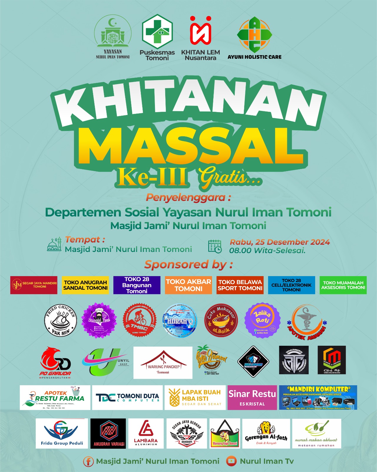 Kegiatan khitanan massal ini merupakan program kerja Depsos Yayasan Nurul Iman Tomoni dan akan diselenggarakan tiap tahunnya.insyaAllah.