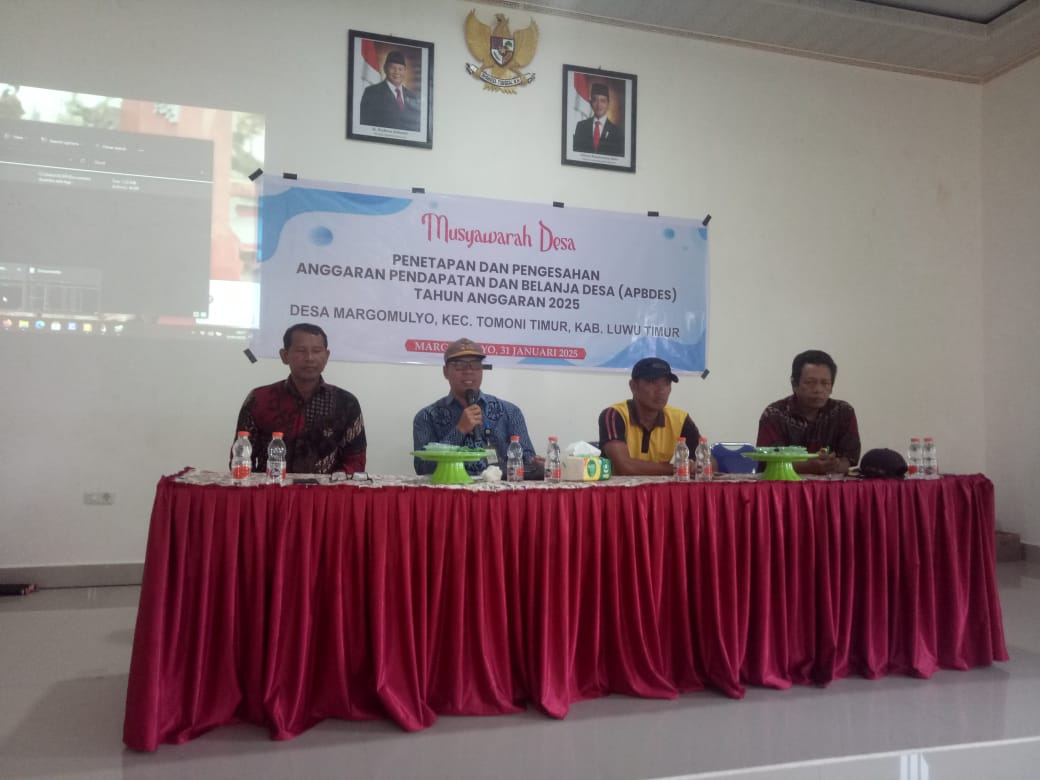 Luwurayapos.com-Desa Margomulyo, Kecamatan Tomoni Timur, resmi menetapkan Anggaran Pendapatan dan Belanja Desa (APBDes) tahun 2025 sebesar Rp2.711.857.924. Penetapan anggaran ini dilakukan dalam rapat yang digelar pada Jumat, 31 Januari 2025, di Aula Kantor Desa Margomulyo. Rapat tersebut dihadiri oleh Camat Tomoni Timur, Yulius, Kapolsek Tomoni Timur Iptu Awaluddin, Kepala Desa Margomulyo Suwanto, Ketua BPD I Wayan Nurja, para kepala dusun, pendamping desa, serta tokoh masyarakat setempat.