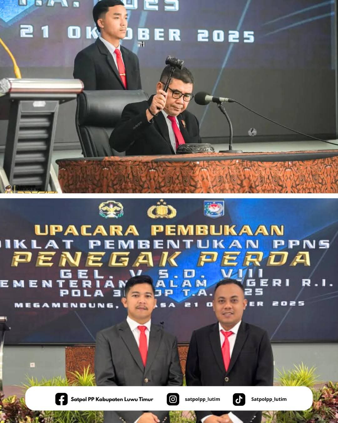 Luwu Timur, Luwurayapos.com — Dalam upaya memperkuat penegakan Peraturan Daerah (Perda) sekaligus meningkatkan profesionalisme aparatur, Satuan Polisi Pamong Praja (Satpol PP) Kabupaten Luwu Timur mengutus dua personelnya, Yudi Burhan, S.H., M.H. dan Wan Gun Tomo, S.H., untuk mengikuti Pendidikan dan Pelatihan (Diklat) Pembentukan Penyidik Pegawai Negeri Sipil (PPNS) Penegak Perda Tahun Anggaran 2025 yang digelar di Megamendung, Kabupaten Bogor, Jawa Barat.