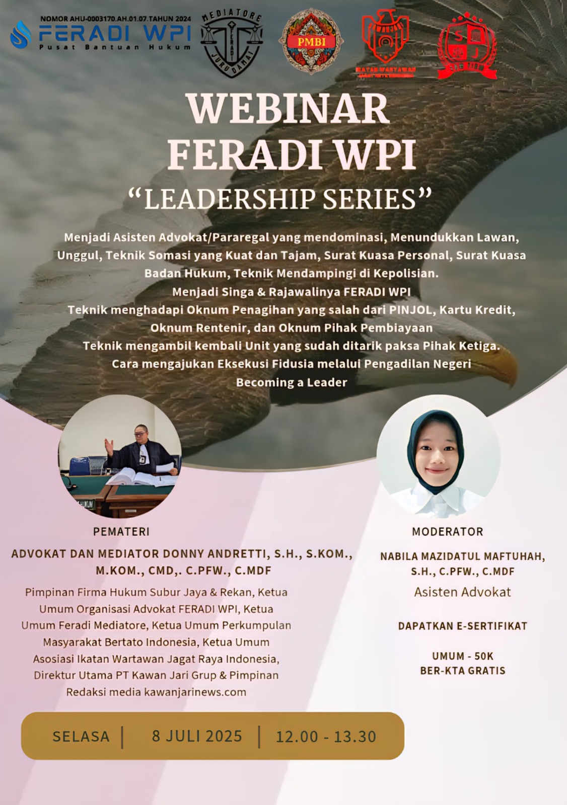 Luwurayapos.com Jakarta, 8 Juli 2025 — FERADI WPI akan menyelenggarakan webinar nasional bertajuk “Leadership Series” pada Selasa, 8 Juli 2025 pukul 12.00–13.30 WIB. Kegiatan ini menjadi bagian dari agenda edukatif FERADI WPI untuk memperkuat kualitas pendamping hukum di tengah masyarakat.