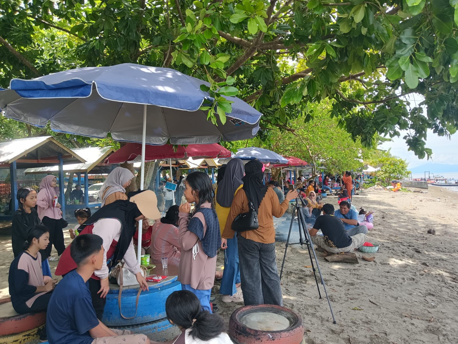 Selain menikmati panorama pantai, pengunjung juga terlihat menghabiskan waktu dengan berenang, bersantai bersama keluarga, hingga mengabadikan momen di sejumlah spot foto yang tersedia.