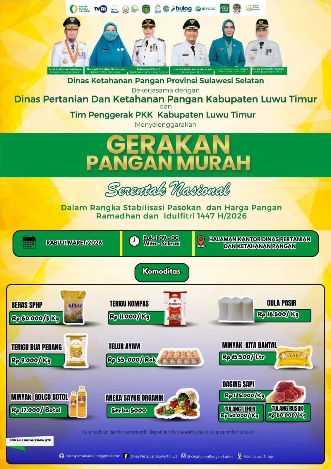 Luwu Timur, Luwurayapos.com – Dalam rangka menjaga stabilitas pasokan dan harga pangan selama bulan Ramadan hingga menjelang Idulfitri 1447 H/2026, Dinas Ketahanan Pangan Provinsi Sulawesi Selatan bekerja sama dengan Dinas Pertanian dan Ketahanan Pangan Kabupaten Luwu Timur serta Tim Penggerak PKK Kabupaten Luwu Timur menggelar kegiatan Gerakan Pangan Murah Serentak Nasional.