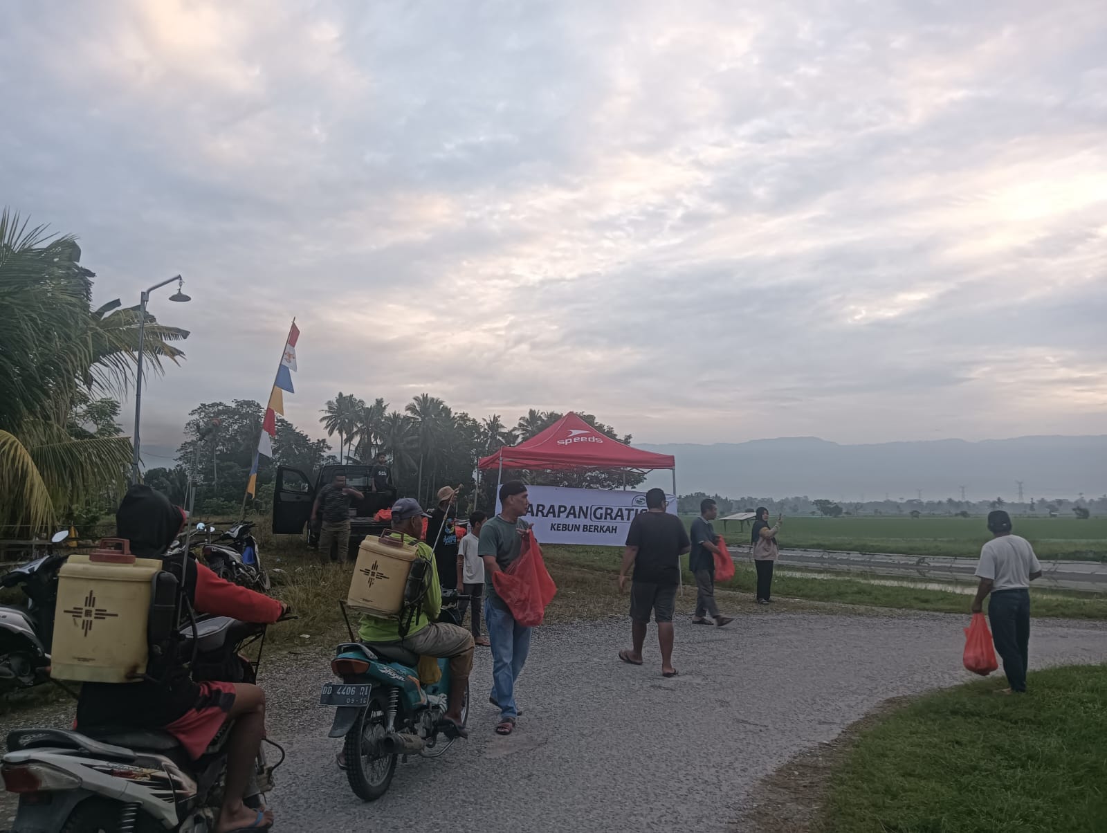 “Sarapan gratis ini merupakan kepedulian terhadap masyarakat, terutama bagi petani yang melintas akan ke sawah atau kebun mereka, Mudah-mudahan tidak sampai di sini saja, dan KEBUN BERKAH selalu di berikan rezeki dan hasil panen tanamannya selalu diberi keberhasilan ” harap Dian