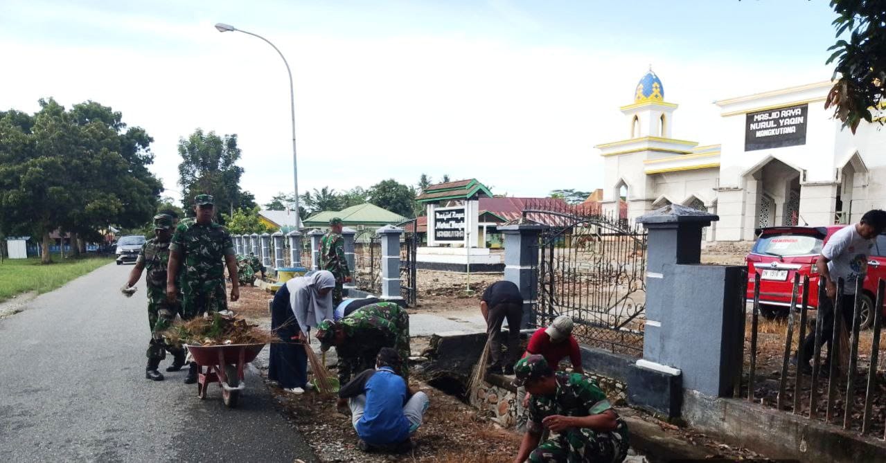 Luwu Timur, Luwurayapos.com — Babinsa Koramil 1403-14/Mangkutana melaksanakan kegiatan karya bakti atau gotong royong bersama pemerintah kecamatan dan masyarakat di Desa Wonorejo, Kecamatan Mangkutana, Kabupaten Luwu Timur, Senin (9/3/2026).