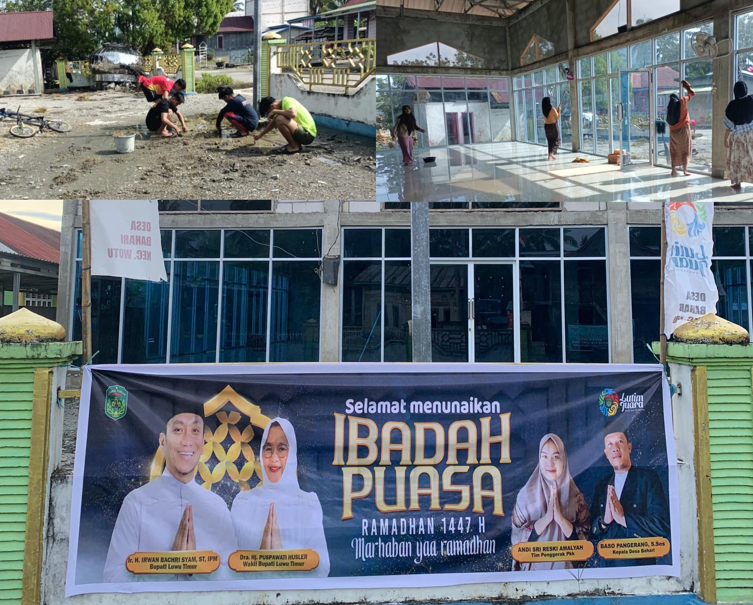 Luwu Timur, Luwurayapos.com – Menyambut bulan suci Ramadan 1447 Hijriah, Pemerintah Desa (Pemdes) Bahari bersama Majelis Taklim dan mahasiswa Kuliah Kerja Nyata (KKN) dari Universitas Cokroaminoto Palopo (UNCP) melaksanakan kegiatan gotong royong pembersihan masjid yang dirangkaikan dengan pemasangan baliho ucapan Selamat Menunaikan Ibadah Puasa, Rabu (18/02/2026).
