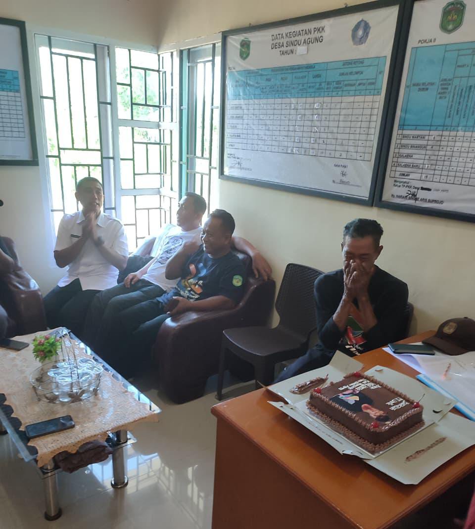 Kejutan berlangsung di Kantor Desa Sindu Agung, dihadiri oleh seluruh staf dan tokoh masyarakat setempat, menciptakan suasana hangat penuh kekeluargaan.