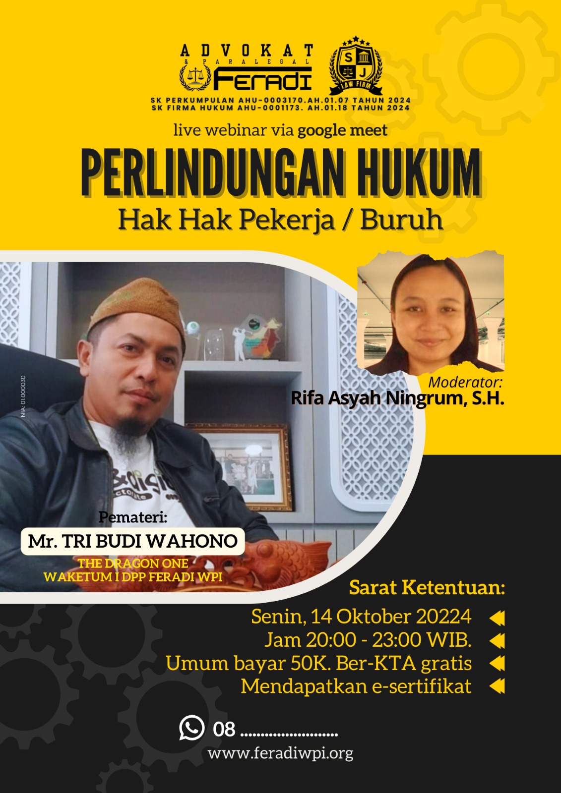 Luwurayapos.com-Setiap Hari Senin malam pk. 20.00 WIB – Selesai.. Firma Hukum Subur Jaya dan Rekan di bawah naungan organisasi Advokat & Paralegal FERADI WPI rutin mengadakan Pendidikan Pelatihan Hukum melalui Google Meet. Dimana semua orang boleh ikut dengan mengganti biaya e-sertifikat sebesar 50ribu, akan tetapi GRATIS bagi pemegang KTA SUBUR JAYA LAWFIRM / FERADI WPI dan masi berlaku masa aktiv KTA nya.