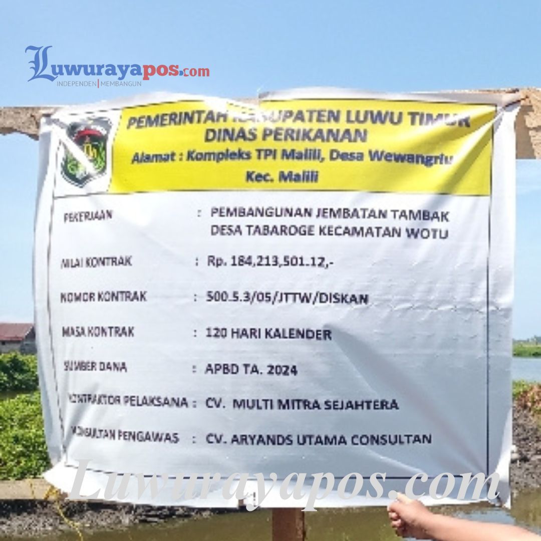 Dinas Perikanan dan Kelautan Kabupaten Luwu Timur telah menganggarkan pembangunan Jembatan Tambak dan pengerasan jalan didusun Tabaroge, Desa Tabaroge Kec. Wotu, Luwu Timur, Tahun Anggaran 2024 diantaranya :