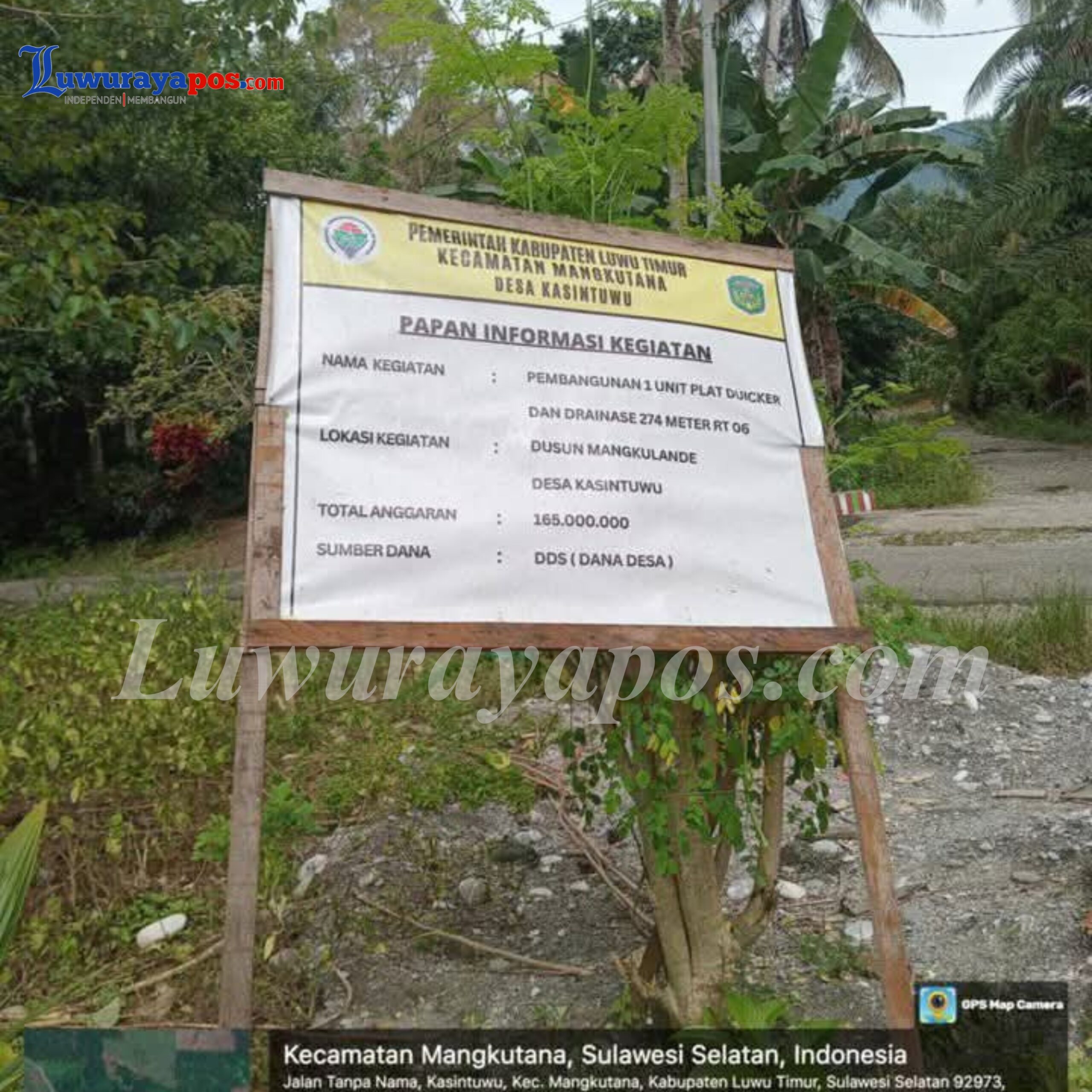 Luwurayapos.com, Luwu Timur – Proyek Dana Desa (DDS) tahun 2024 di Dusun Mangkulande, dan dusun Tongkomaino Desa Kasintuwu, Kecamatan Mangkutana, sampai saat ini masih dalam proses penyelesaian.