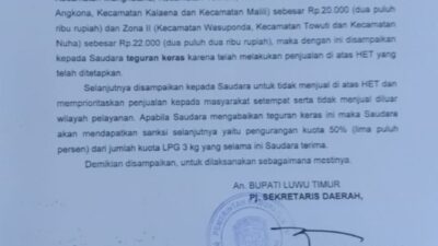 Luwu Timur, Luwurayapos.com – Pemerintah Kabupaten Luwu Timur melalui Sekretariat Daerah resmi mengeluarkan Teguran Keras (Step I) kepada para pengelola pangkalan LPG 3 kilogram yang terbukti menjual gas bersubsidi di atas Harga Eceran Tertinggi (HET).