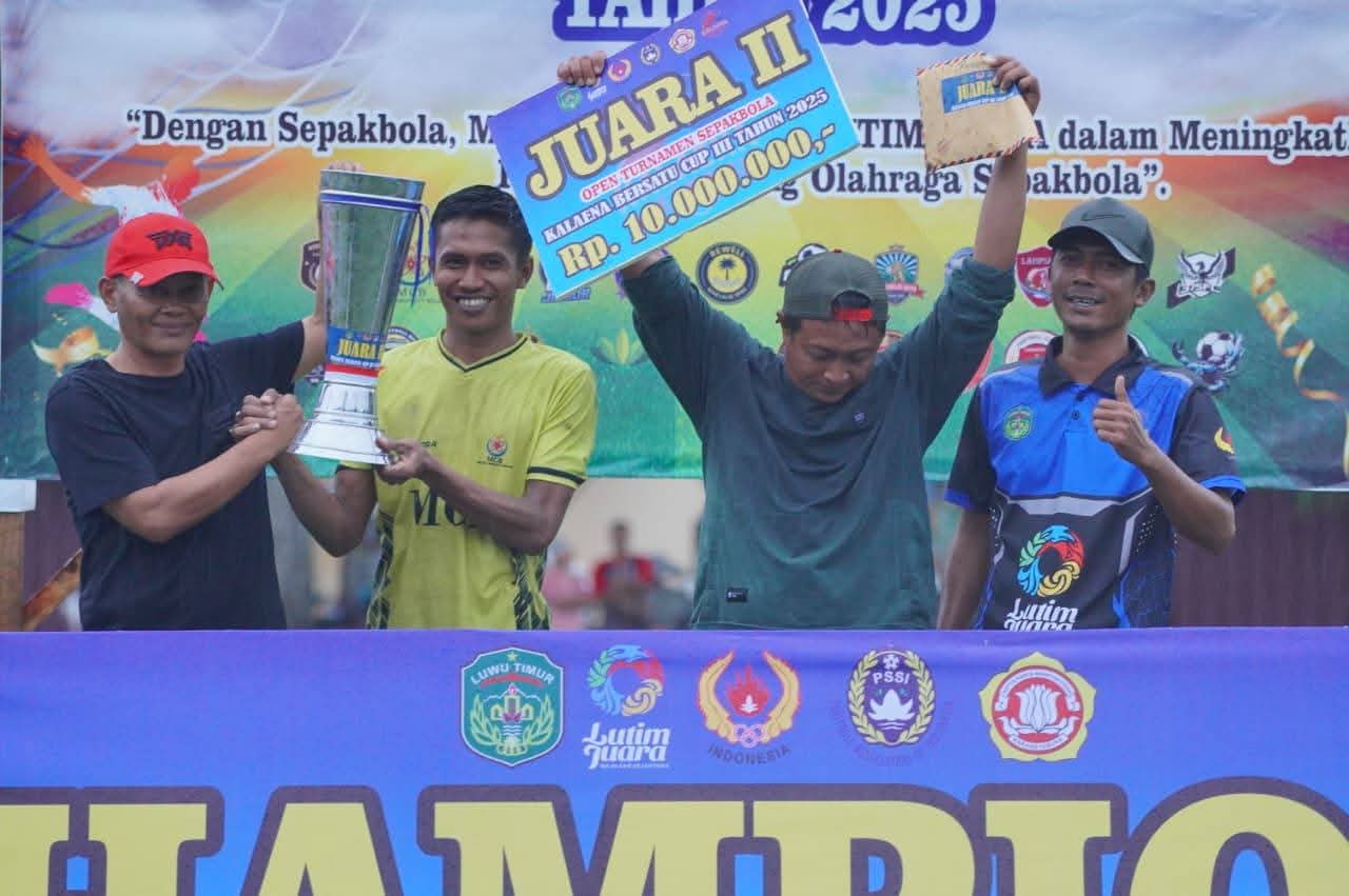 Luwu Timur, Luwurayapos .com – Wakil Ketua I DPRD Luwu Timur, Jihadin Peruge, menghadiri secara langsung penutupan Open Turnamen Sepakbola Kalaena Bersatu Cup III Tahun 2025 yang berlangsung di Lapangan Jati Lomba, Desa Kalaena Kiri, Kecamatan Kalaena, Selasa (9/12/2025).